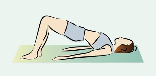 Legen Sie sich in Rückenlage flach auf die Matte und winkeln Sie die Beine an. Stellen Sie die Füße etwa hüftbreit mit der ganzen Sohle auf. Ihre Hände liegen flach neben dem Rumpf, mit den Handinnenflächen nach unten gerichtet. Nun heben Sie Ihr Becken in Richtung Decke. Wichtig ist, dass Rumpf und Beine dabei eine Linie bilden. Halten Sie diese Position für 10 bis 15 Sekunden und senken Sie Ihr Becken anschließend wieder ab. Diese Übung sollte sechsmal wiederholt werden.