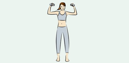 Nehmen Sie eine aufrechte Position im Stand ein. Dabei stehen Ihre Beine hüftbreit auseinander. Nun heben Sie die Arme seitlich Ihres Körpers in die Höhe und winkeln diese so an, dass zwischen Ober- und Unterarmen ein 90°-Winkel entsteht. Ihre Ellbogen befinden sich auf Schulterhöhe. Anschließend strecken Sie die Arme senkrecht nach oben, um diese dann wieder in die vorherige Position zurückzubringen. Beachten Sie, dass der Blick nach vorne gerichtet und der Nacken gerade ausgerichtet ist.