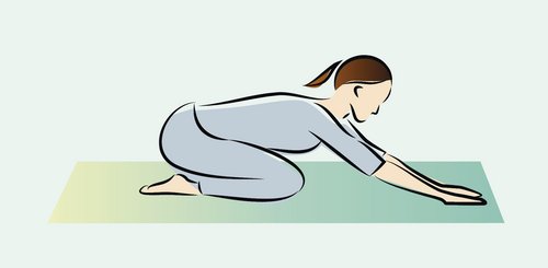 Beim Ausatmen bewegen Sie Ihr Gesäß nach hinten und platzieren es auf den Fersen. Die Arme befinden sich nun ausgestreckt vor Ihrem Körper auf der Matte und Ihr Blick richtet sich nach unten. Beim Einatmen heben Sie Ihr Becken wieder in die Ausgangsposition des Vierfüßlerstands zurück. Diese Übung wird fünfmal durchgeführt.