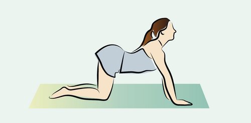 Nehmen Sie den Vierfüßlerstand ein. Die Beine stehen hüftbreit auf der Matte, die Arme senkrecht und ausgestreckt unter den Schultern. Formen Sie zuerst ein Hohlkreuz und nehmen Ihren Kopf leicht nach hinten. Halten Sie diese Position kurz und bewegen dann Ihren Rücken nach oben, sodass Ihre Wirbelsäule einen Katzenbuckel bildet. Dabei ziehen Sie Ihren Kopf in Richtung Brust. Auch diese Position wird für einige Sekunden gehalten.