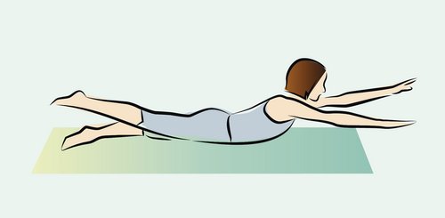 Legen Sie sich mit dem Bauch flach auf den Boden, die Beine etwas auseinander. Die Arme liegen neben dem Körper, die Handflächen zeigen nach oben. Nun spannen Sie Bauch, Rücken und Po an und heben den Oberkörper sowie die Beine leicht von der Matte an.