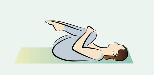 Winkeln Sie die Beine an, sodass zwischen Ober- und Unterschenkeln ein 90°-Winkel entsteht. Umfassen Sie die Schienbeine anschließend mit den Armen und ziehen Sie die Beine zum Körper heran. Heben Sie nun Kopf und Schultern leicht vom Boden ab und schaukeln langsam fünfzehnmal vor und zurück.