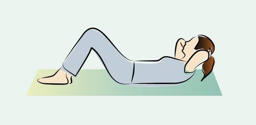 Legen Sie sich flach in Rückenlage auf die Matte, dann winkeln Sie Ihre Beine an und verschränken die Arme hinter dem Kopf. Anschließend heben Sie Ihren Oberkörper von der Matte ab, wobei Kopf und Nacken die Verlängerung der Wirbelsäule bilden, mit dem Blick nach oben gerichtet.