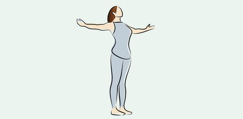 Stellen Sie sich aufrecht hin, die Beine hüftbreit auseinander und die Arme locker neben dem Körper.