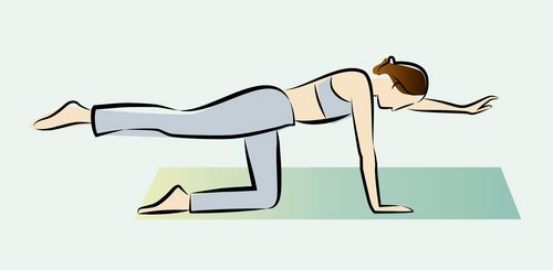 Nehmen Sie den Vierfüßlerstand ein. Die Arme sind gestreckt und senkrecht unter den Schultern auf der Matte platziert. Die Beine stehen angewinkelt unter der Hüfte. Nun strecken Sie den rechten Arm und das linke Bein gerade aus.