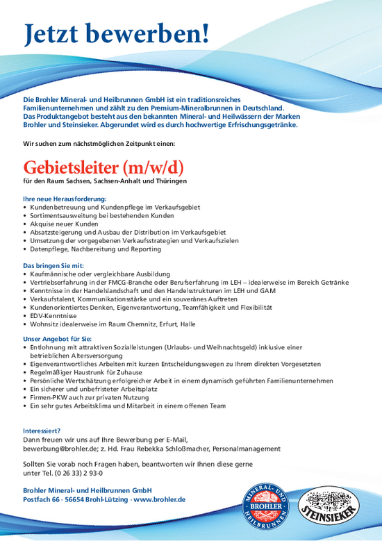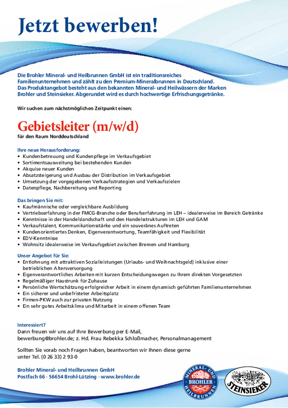 Zu Ihrem Aufgabengebiet zählt unter anderem die Kundenbetreuung und die Kundenpflege in Ihrem Verkaufsgebiet. Außerdem kümmern Sie sich um die Sortimentsausweitung bei bestehenden Kunden sowie...