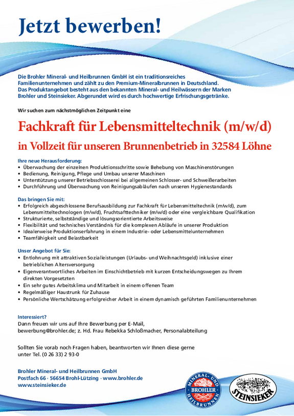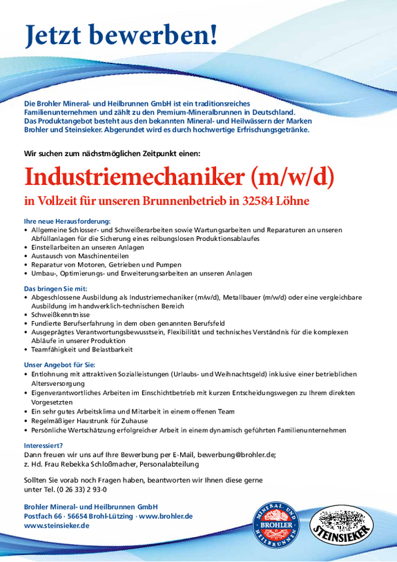 Zu Ihrem Aufgabengebiet zählen unter anderem allgemeine Schlosser- und Schweißerarbeiten sowie Wartungsarbeiten und Reperaturen an unseren Abfüllanlagen für die Sicherung eines reibungslosen Produktionsablaufes. Außerdem kümmern Sie sich um den Austausch von Maschinenteilen und Einstellarbeiten...